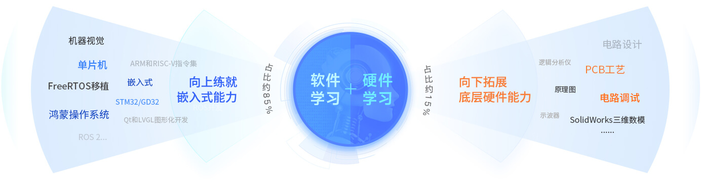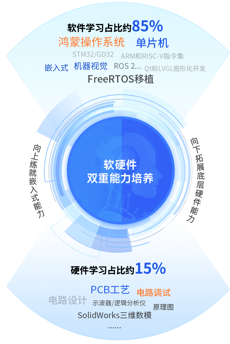 培养理论基础扎实,实践经验丰富的人才,学员具备实际的技术应用能力,能够设计、开发和测试各种智能产品和系统,包括嵌入式系统、智能应用程序、鸿蒙操作系统和物联网设备。毕业后可以在互联网企业、制造业、医疗健康领域、智能交通、智能家居、人形机器人等领域从事智能软硬件开发。